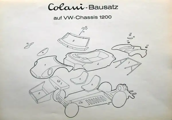 6 Fotos, 1 Negativ, VW-Bausatz Blatt, Umschlag mit Colani-Marke, Prospekt