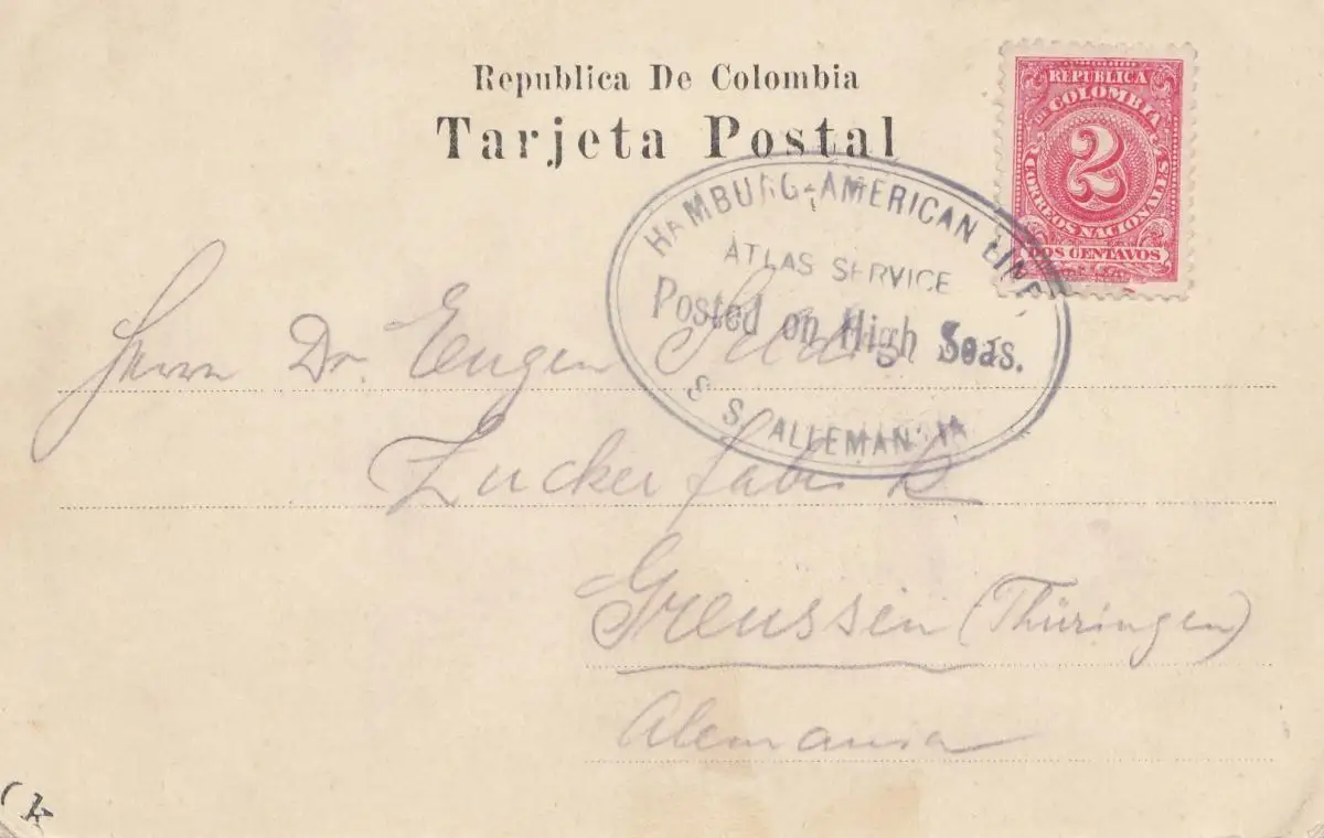 Colombia post card Barranquilla via Hamburg-American Linie, High Sea Posted