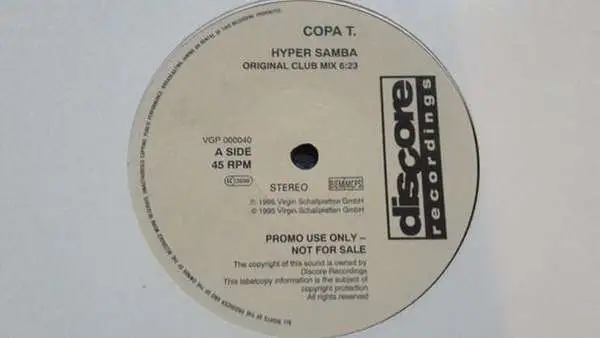 12" Maxi Copa T. - Hyper Samba, Promo, Einheitscover der Plattenfirma, Zustand Platte VG+ Hülle VG+; Made in Netherlands 1995 Discore Recordings VGP 000040, Tracks Original Club Mix 6:23, Samba Triangle 3:35, Radio Edit 3:44