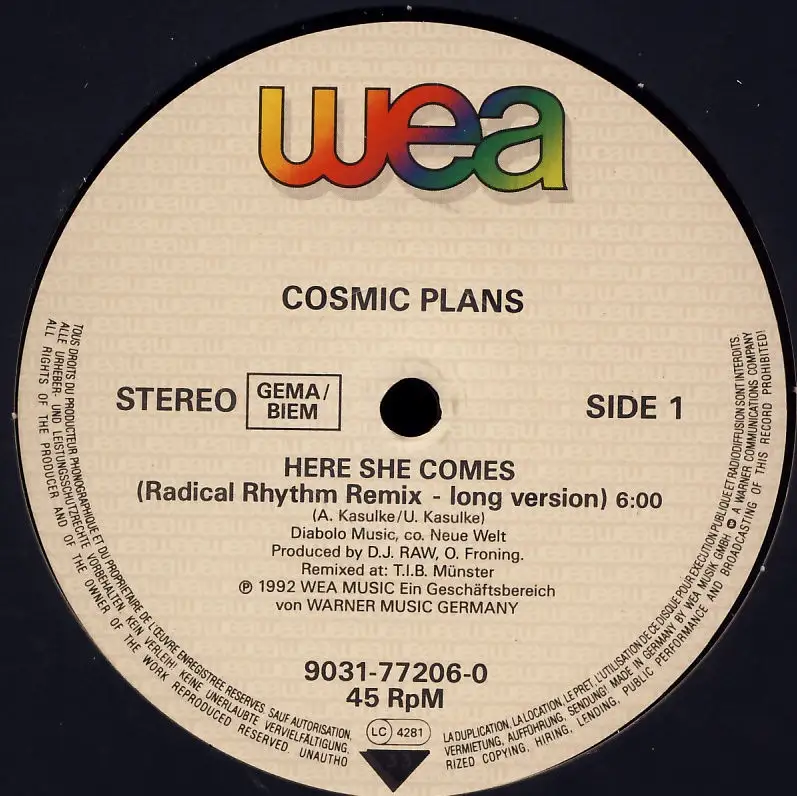 12" Maxi Cosmic Plans - Here She Comes, Einheitscover der Plattenfirma, Zustand Platte VG+ Hülle VG+; Made in Germany 1992 WEA Records 9031-77206-0, Tracks Radical Rhythm RMX Long Vers. 6:00, Radical Rhythm RMX Short Vers. 3:49, Original Single Vers. 3:52