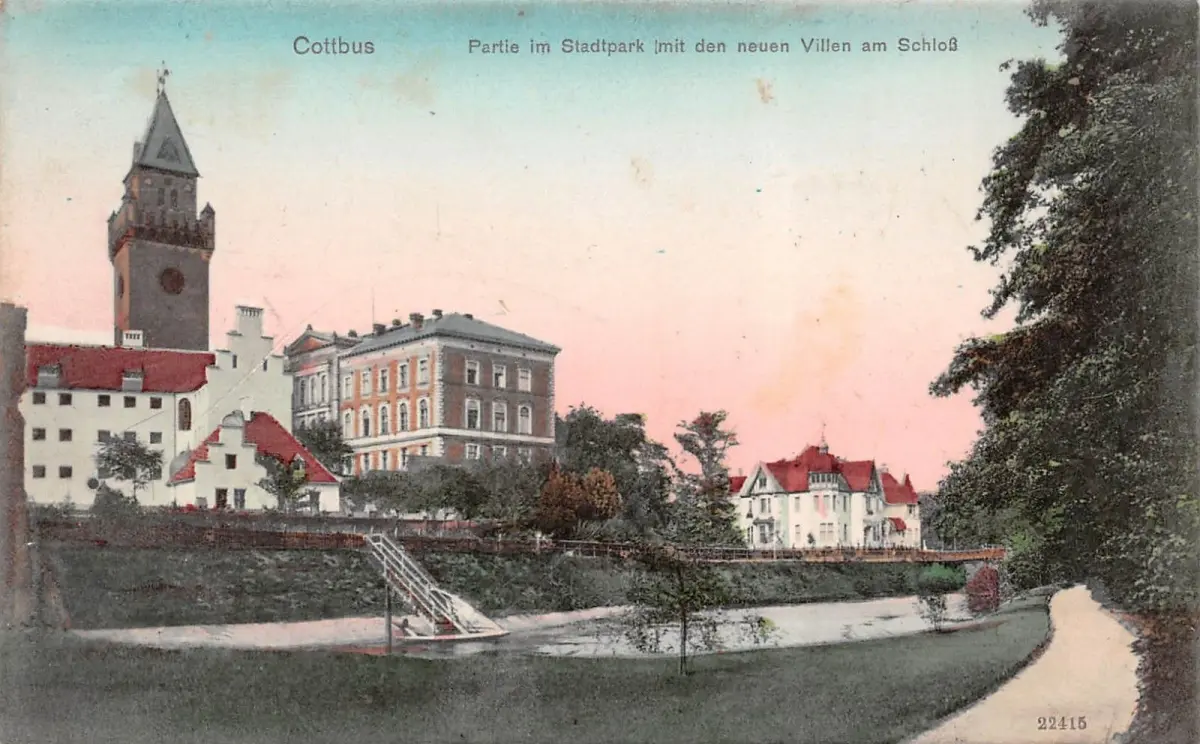Cottbus Partie im Stadtpark mit den neuen Villen am Schloß Postkarte AK