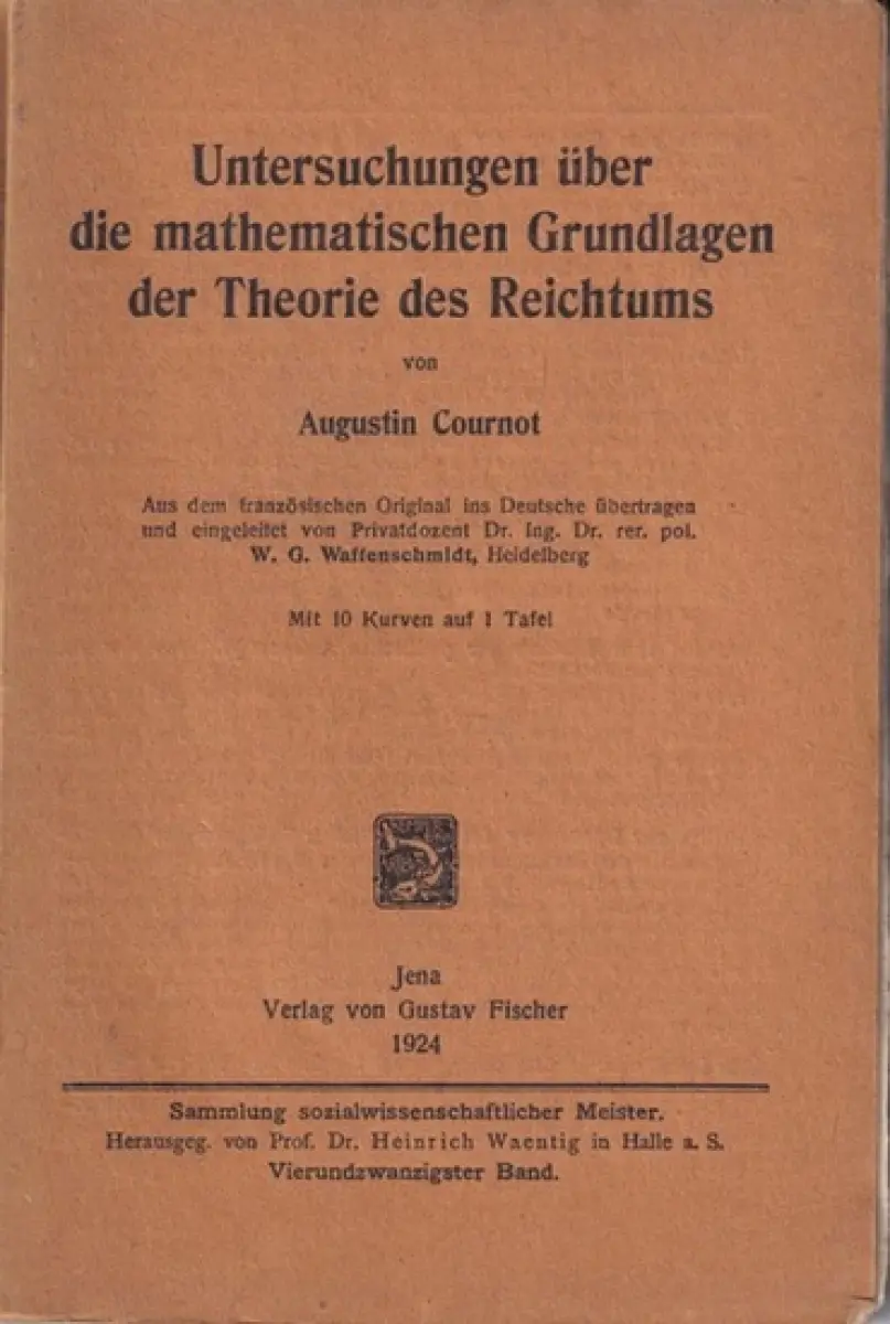 Cournot, Augustin - W.G. Waffenschmidt (Übers. / Einleitung) / Heinrich Waentig (Hrsg.): Untersuchungen über die mathematischen Grundlagen der Theorie des Reichtums. (= Sammlung sozialwissenschaftlicher Meister, vierundzwanzigster Band).