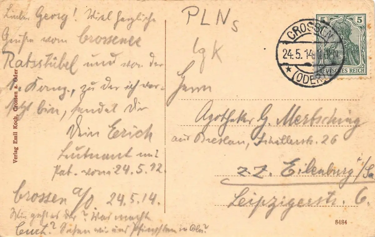 Rückseite: gelaufen 1914 von Crossen (Oder)