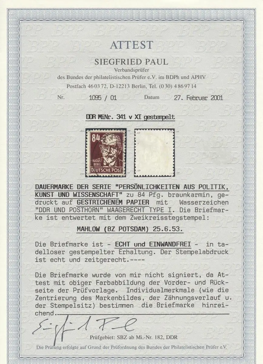 DDR: 1953: MiNr. 341 v XI, gestempelt, BPP Attest