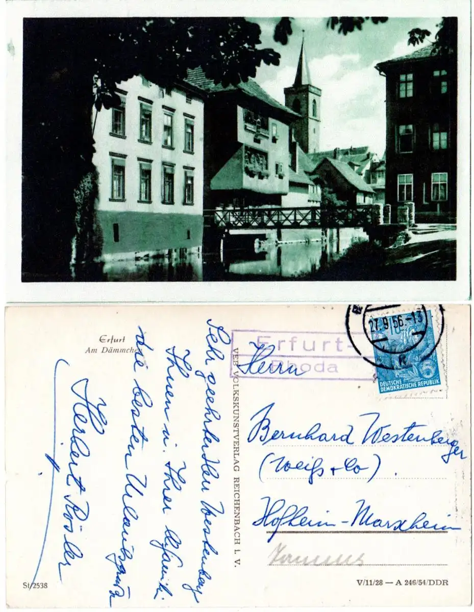 DDR 1956, Landpoststpl. ERFURT-RHODA auf sw-AK m. 10 Pf.