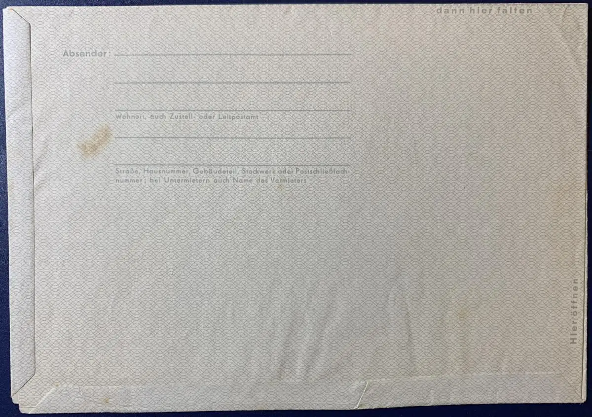 Ganzsache, Faltbrief, Mi.Nr. F1, gelaufen mit Poststempel vom 28.02.1957 von Dresden nach Hamburg-Wandsbek, Brief ist sehr gut erhalten.