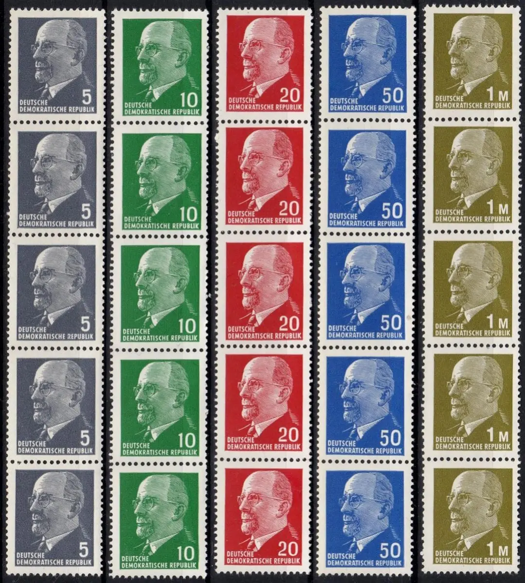 • MichSeite DDR: 1961, 1963, 1970, "Walter Ulbricht", 5 x Rollenstreifen (1), postfrisch Beschreibung \nAusgabeland: DDR \nAusgabeanlass: Briefmarkenausgabe "Walter Ulbricht" Katalognummer: MiNr. 845 X x IB, 846 X x IB, 848 Y x I, 937 a X x I, 1540 Ausgabedatum: 1961, 1963, 1970 Nominale: Wert zu 0,05 DM, 0,10 DM, 0,20 DM, 0,50 M, 1,00 M \nTyp: - \nErhaltung: postfrisch \nHinweis: 5er-Rollenstreifen mir je einer rückseitigen Zählnummer, übliche Erhaltung Thema: Politik, Staat