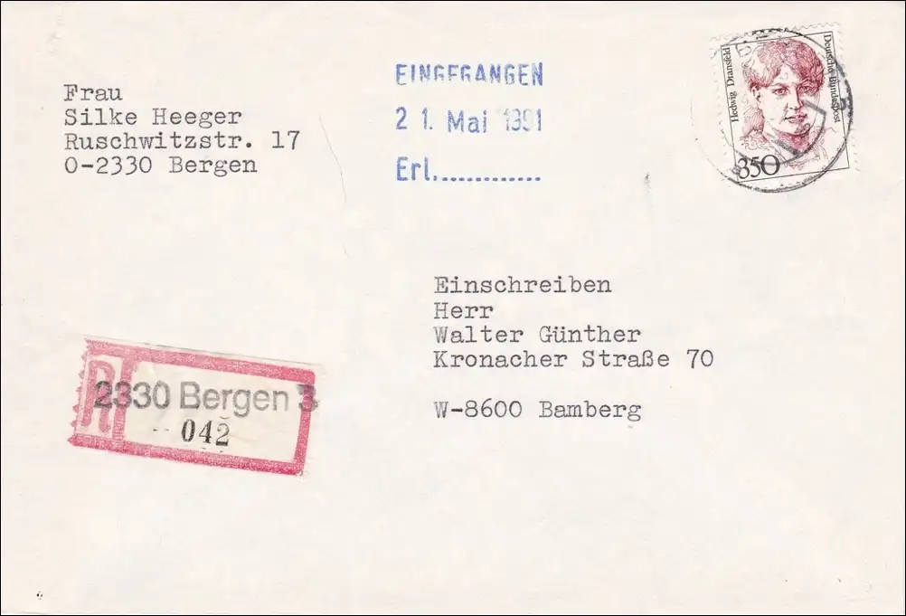 DDR: 1991 - Einschreiben aus Bergen nach Bamberg