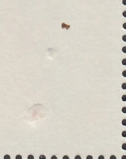 Im Papier sind Einschlüsse, was im dritten Bild wie Kuhlen aussieht sind kleine Knötchen / Papierklumpen im Papier unter dem Gummi, das würde ich sogar wertsteigernd ansehen da Herstellungsbedingt und so selten zu sehen.