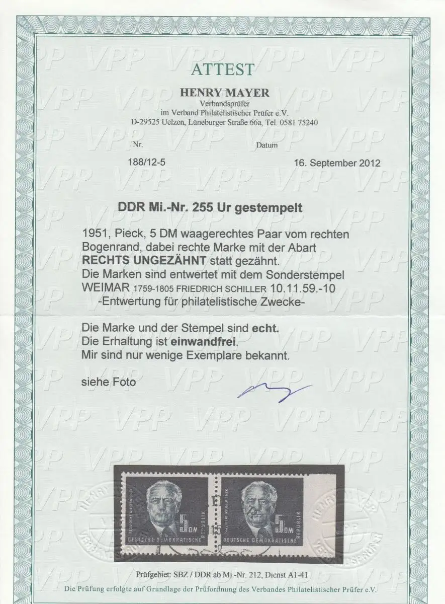 DDR: MiNr. 255 Ur, gestempelt im waagr. Paar, rechts ungezähnt