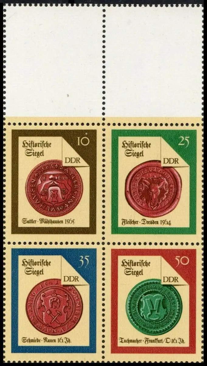 • MichSeite DDR: MiNr. 3156 - 3159 VB L, 22.03.1988, "Historische Siegel (II)", Oberrand, postfrisch Beschreibung \nAusgabeland: DDR \nAusgabeanlass: Briefmarkenausgabe "Historische Siegel (II): Sattler, Fleischer, Schmiede, Tuchmacher" Katalognummer: MiNr. 3156 - 3159 VB L Ausgabedatum: 22.03.1988 Nominale: Satz (4 Werte) zu 0,10 M, 0,25 M, 0,35 M, 0,50 M \nTyp: - \nErhaltung: postfrisch \nHinweis: Viererblock, Oberrand mit Leerfeldern Thema: Zusammendruck