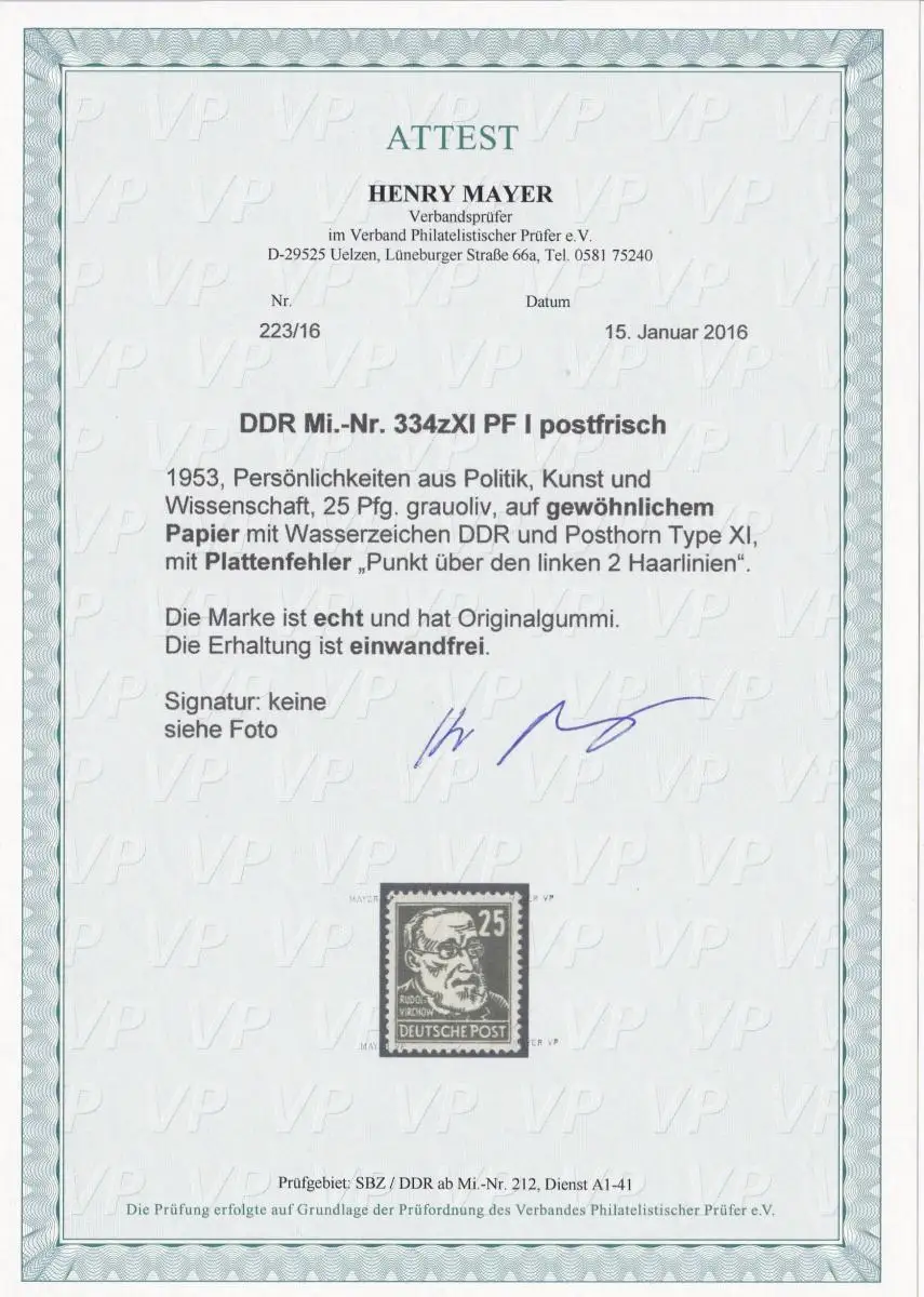 DDR: MiNr. 334 xXI PF I, postfrisch, Plattenfehler