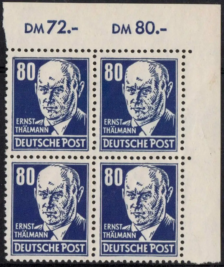 • MichSeite DDR: MiNr. 339 v a X I, 00.00.1953, "Persönlichkeiten aus Politik, Kunst und Wissenschaft: Ernst Thälmann", Viererblock ER, geprüft, postfrisch Beschreibung \nAusgabeland: DDR \nAusgabeanlass: Briefmarkenausgabe "Persönlichkeiten aus Politik, Kunst und Wissenschaft: Ernst Thälmann" Katalognummer: MiNr. 339 v a X I Ausgabedatum: 00.00.1953 Nominale: 0,80 DM \nTyp: - \nErhaltung: Viererblock vom rechten Oberrand, postfrisch \nHinweis: geprüft BPP