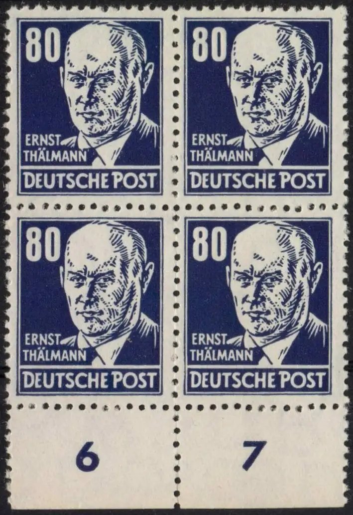• MichSeite DDR: MiNr. 339 v a X I, 00.00.1953, "Persönlichkeiten aus Politik, Kunst und Wissenschaft: Ernst Thälmann", Viererblock UR, geprüft, postfrisch Beschreibung \nAusgabeland: DDR \nAusgabeanlass: Briefmarkenausgabe "Persönlichkeiten aus Politik, Kunst und Wissenschaft: Ernst Thälmann" Katalognummer: MiNr. 339 v a X I Ausgabedatum: 00.00.1953 Nominale: 0,80 DM \nTyp: - \nErhaltung: Viererblock vom Unterrand, postfrisch \nHinweis: geprüft BPP