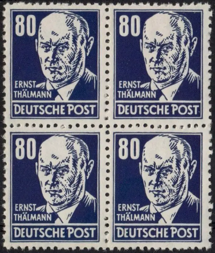 • MichSeite DDR: MiNr. 339 v a X I, 00.00.1953, "Persönlichkeiten aus Politik, Kunst und Wissenschaft: Ernst Thälmann", Viererblock, geprüft, postfrisch Beschreibung \nAusgabeland: DDR \nAusgabeanlass: Briefmarkenausgabe "Persönlichkeiten aus Politik, Kunst und Wissenschaft: Ernst Thälmann" Katalognummer: MiNr. 339 v a X I Ausgabedatum: 00.00.1953 Nominale: 0,80 DM \nTyp: - \nErhaltung: Viererblock, postfrisch \nHinweis: geprüft BPP