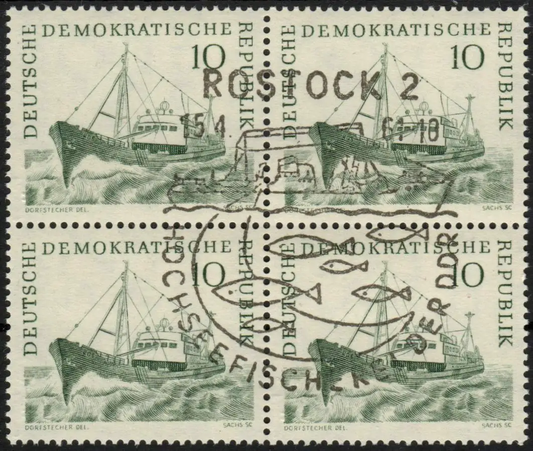 • MichSeite DDR: MiNr. 817 X, 10.04.1961, "Hochseefischerei", geprüft, Viererblock, Ersttagssonderstempel (Bogenentwertung) Beschreibung \nAusgabeland: DDR \nAusgabeanlass: Briefmarkenausgabe "Hochseefischerei" Katalognummer: MiNr. 817 X Ausgabedatum: 10.04.1961 Nominale: 0,10 DM \nTyp: - \nErhaltung: Viererblock, Ersttagssonderstempel (Bogenentwertung) \nHinweis: geprüft BPP