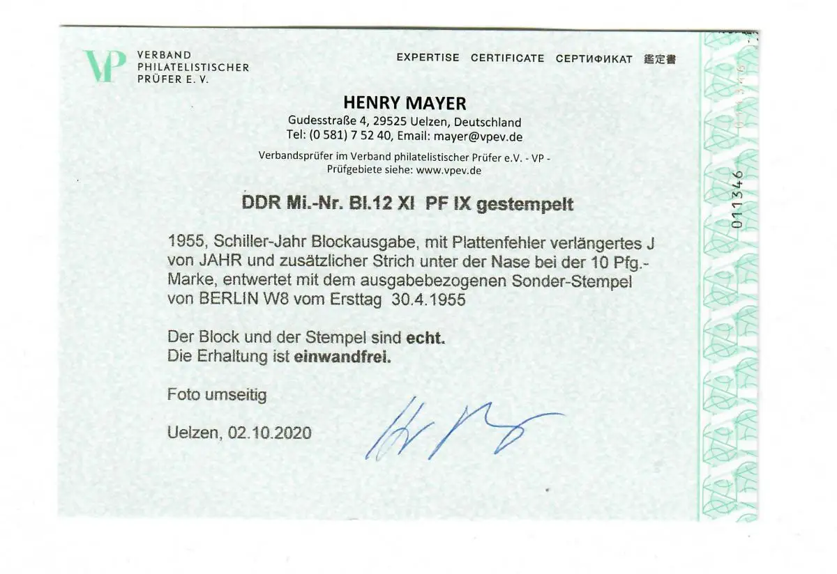 DDR: MiNr. Block 12 XI Plattenfehler IX, gestempelt Ersttag 1955, VPP Befund