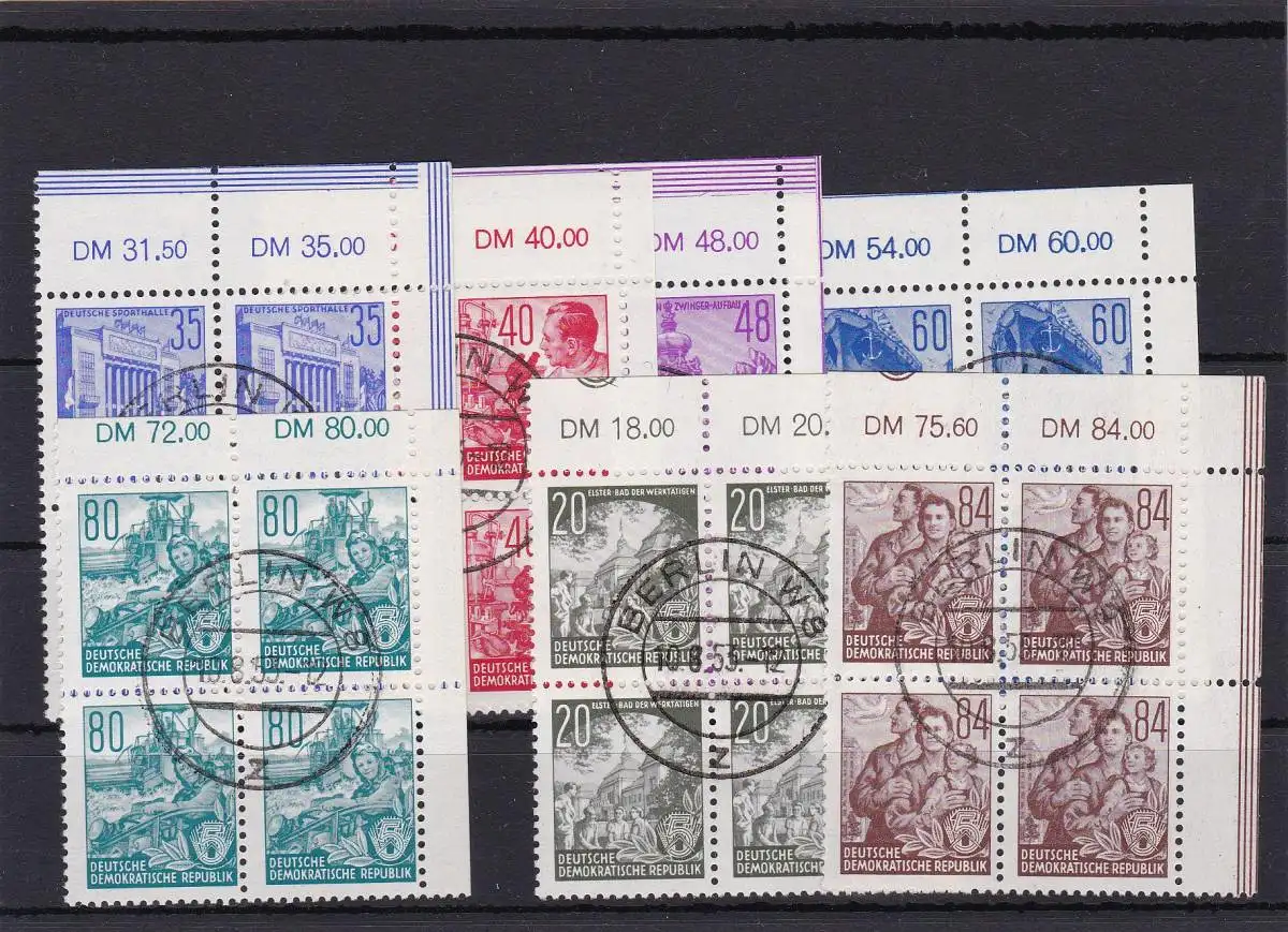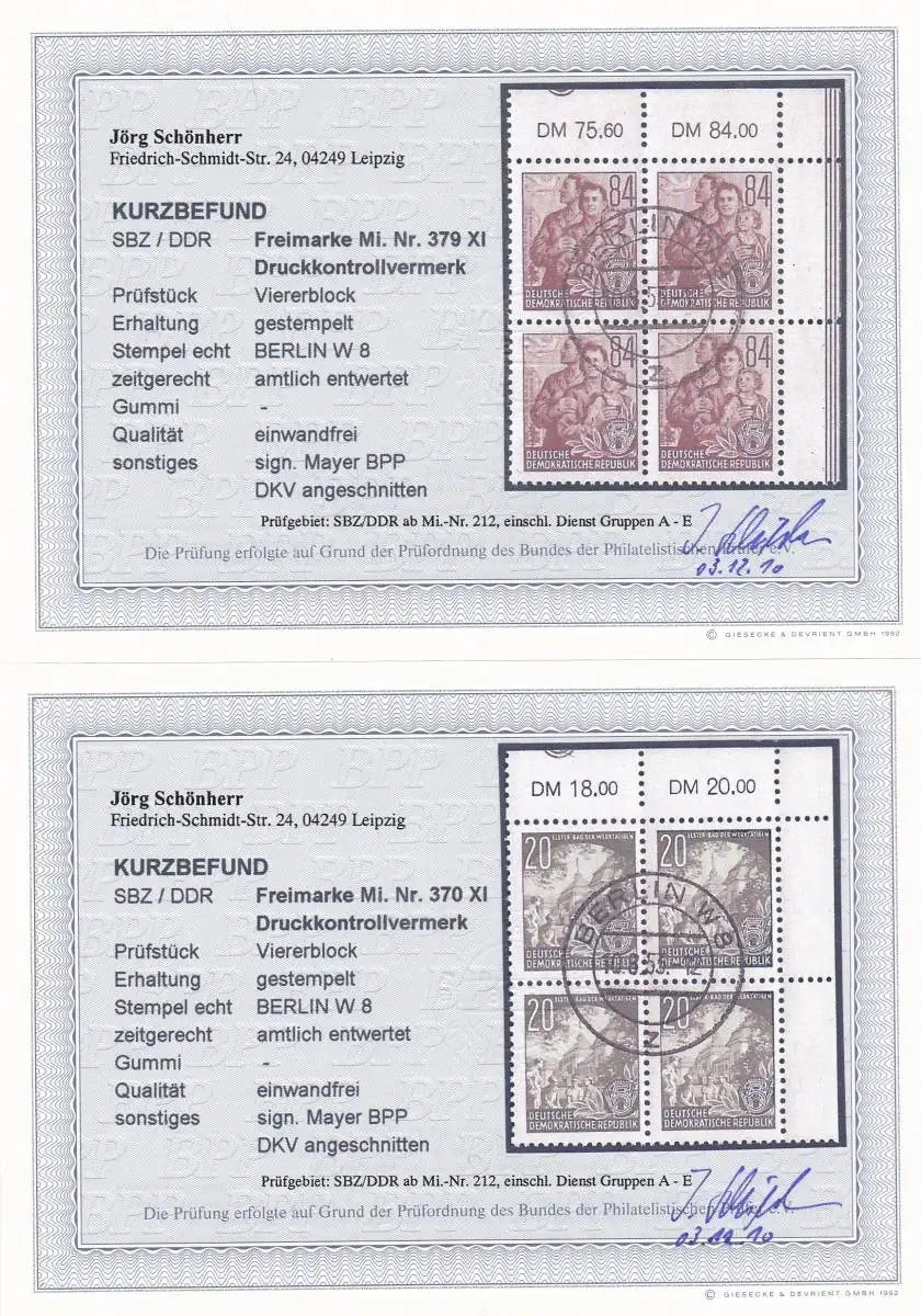 DDR MiNr. ex 362/379, DKV, einheitl. Vierblöcke, Bogenecke, 2x BPP Befund