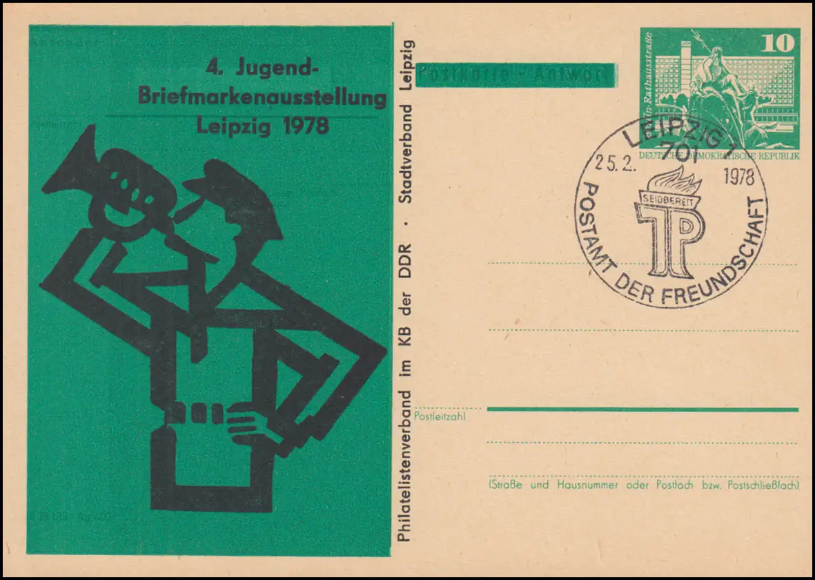 Zudruck-Ganzsache DDR-Postkarte P 79 Antwortkarte Bauwerke Großformat 10 Pfennig Berlin Rathausstraße,4. Jugend-Briefmarkenausstellung Stadtverband Leipzig im Kulturbund der DDR