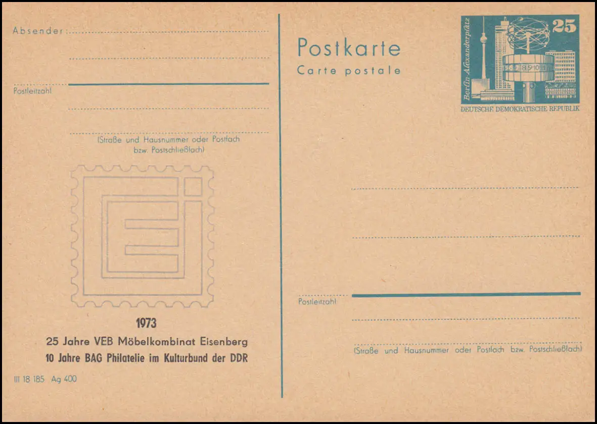 Zudruck-Ganzsache DDR-Postkarte P 80 Bauwerke Großformat 25 Pfennig Berlin Alexanderplatz, Fernsehturm Hotelhochhaus, 25 Jahre VEB Möbelkombinat Eisenberg / 10 Jahre BAG Philatelie im Kulturbund der DDR