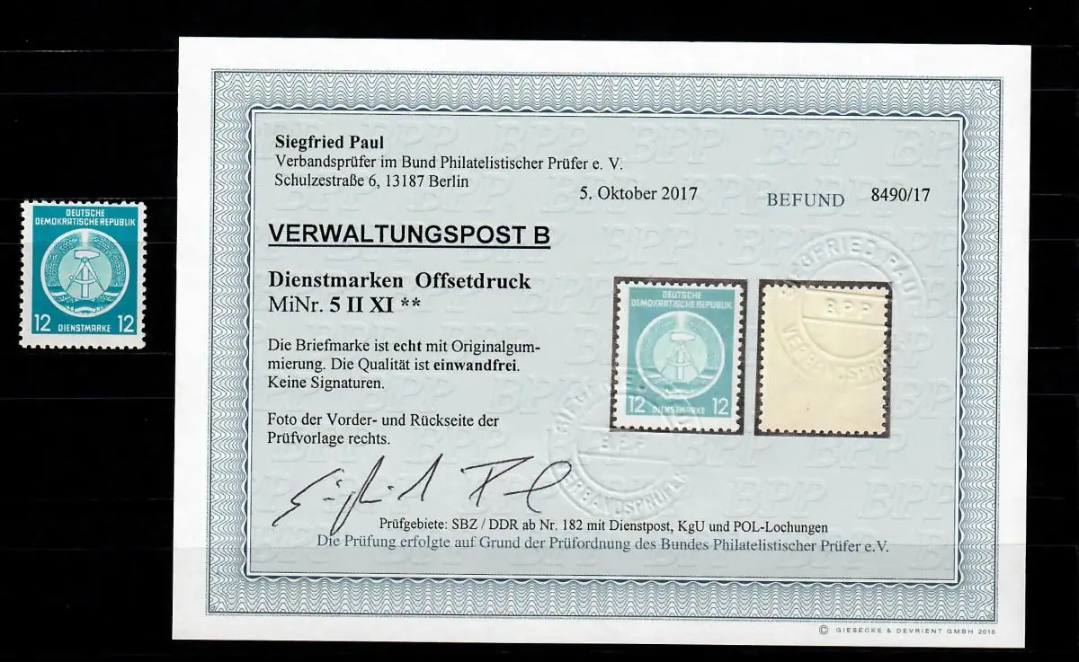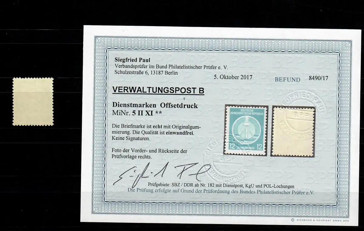 DDR Verwaltungspost B, Dienstmarke MiNr. 5 II XI, ** postfrisch, BPP Befund
