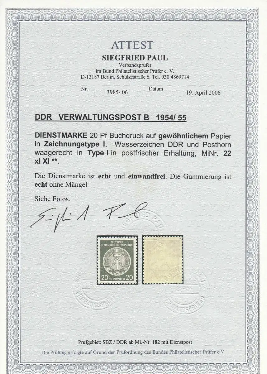 DDR: Verwaltungspost B: MiNr. 22 xI XI, postfrisch, BPP Attest