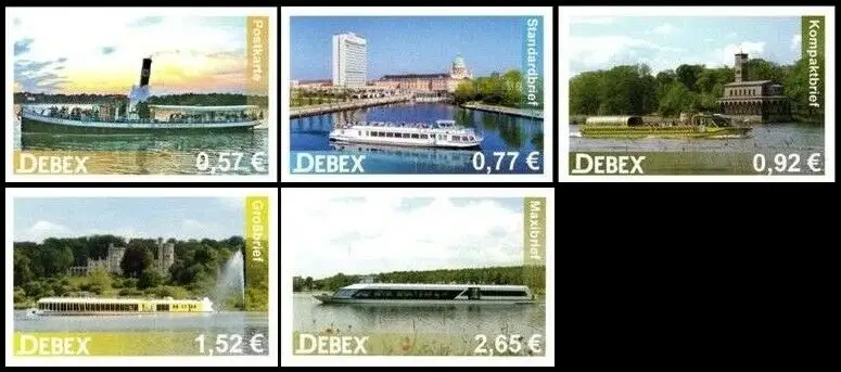 • MichSeite DEBEX: MiNr. 57 - 61, 01.07.2019, "Fahrgastschiffe", Satz, postfrisch Beschreibung \nAusgabeland: Bundesrepublik Deutschland \nPostdienstleister: DEBEX, Potsdam \nAusgabeanlass: Briefmarkenausgabe "Fahrgastschiffe" Katalognummer: MiNr. 57 - 61 Ausgabedatum: 01.07.2019 Nominale: Satz (5 Werte) zu 0,57 EUR, 0,77 EUR, 0,92 EUR, 1,52 EUR, 2,65 EUR \nTyp: - \nErhaltung: selbstklebend, zähnungsartig gestanzt, postfrisch \nHinweis: -