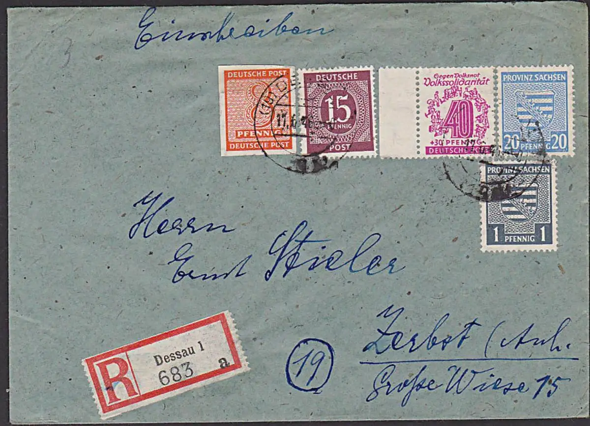 DESSAU in MiF Ziffern und Prov. Sachsen portogenau SBZ 117Y 8 Pf Ziffer steigendes Wz. R-Brief