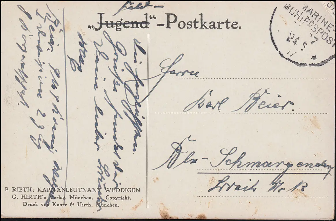 DEUTSCHE MARINE-SCHIFFSPOST 24.5.17 als Feldpost auf AK Kapitänleutnant Wddigen