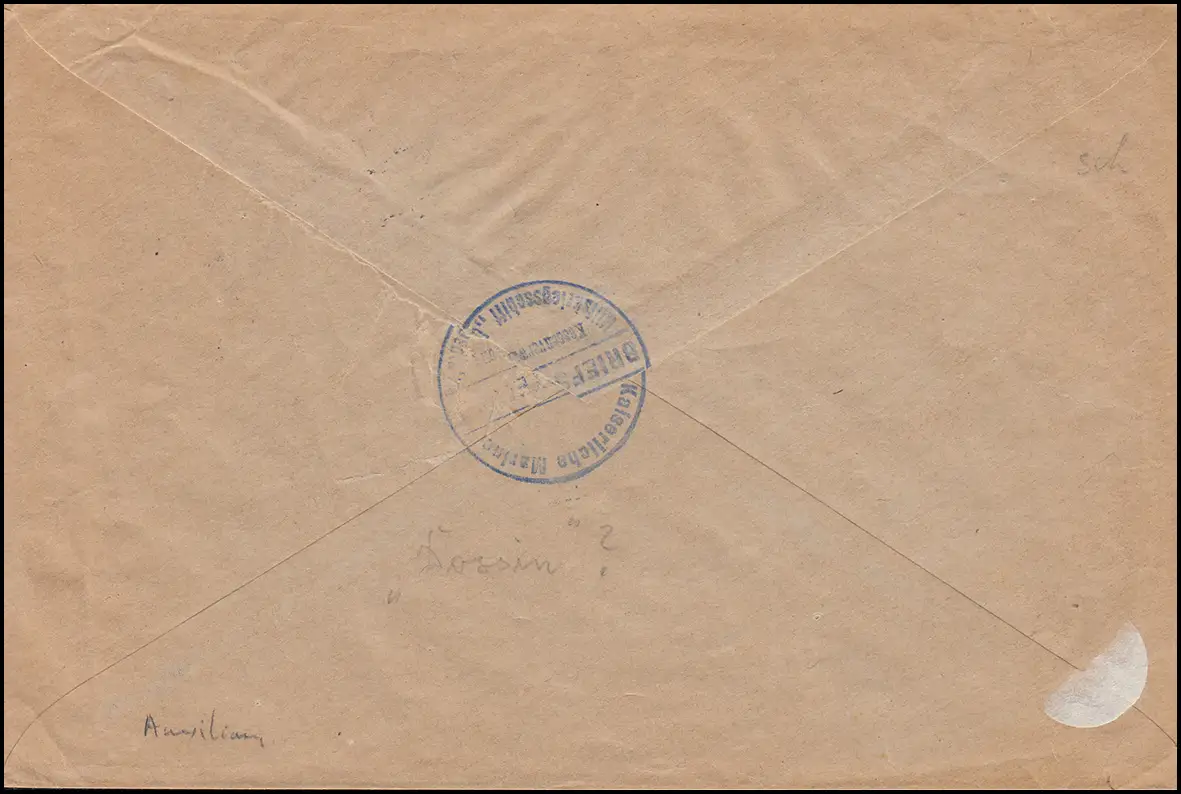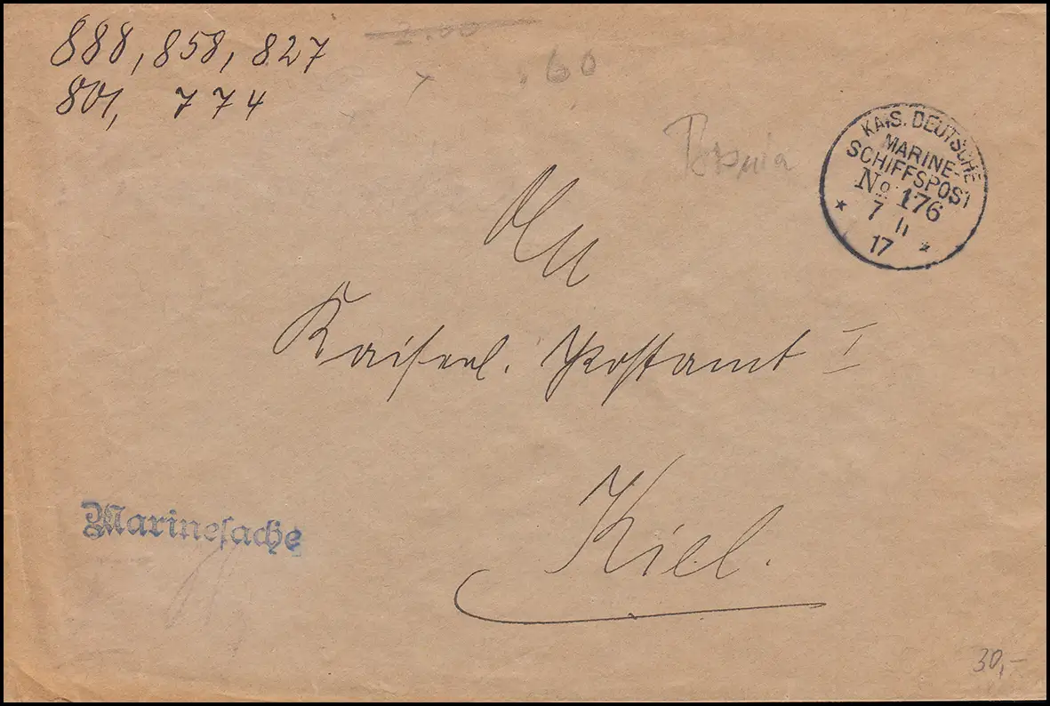 mit Briefstempel "Kassenverwaltung Kriegshilfsschiff Bosnia" nach Kiel