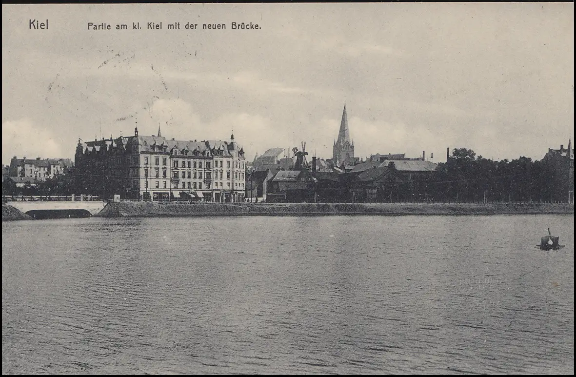 Ansichtskarte "Kiel - Partei am kl. Kiel mit der rneuen Brücke" als Feldpost-Karte nach Chemnitz