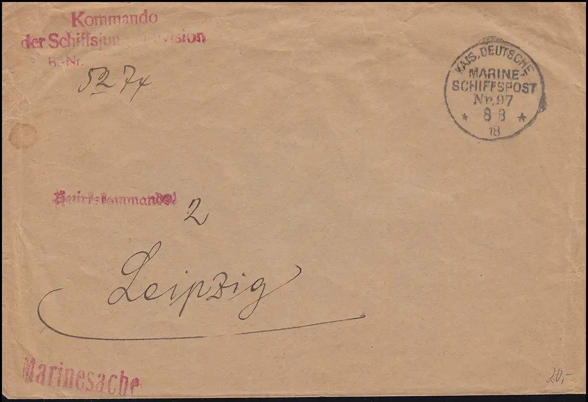 als Marinesache an das Bezirkskommando in Leipzig mit rückseitigem roten Briefstempel