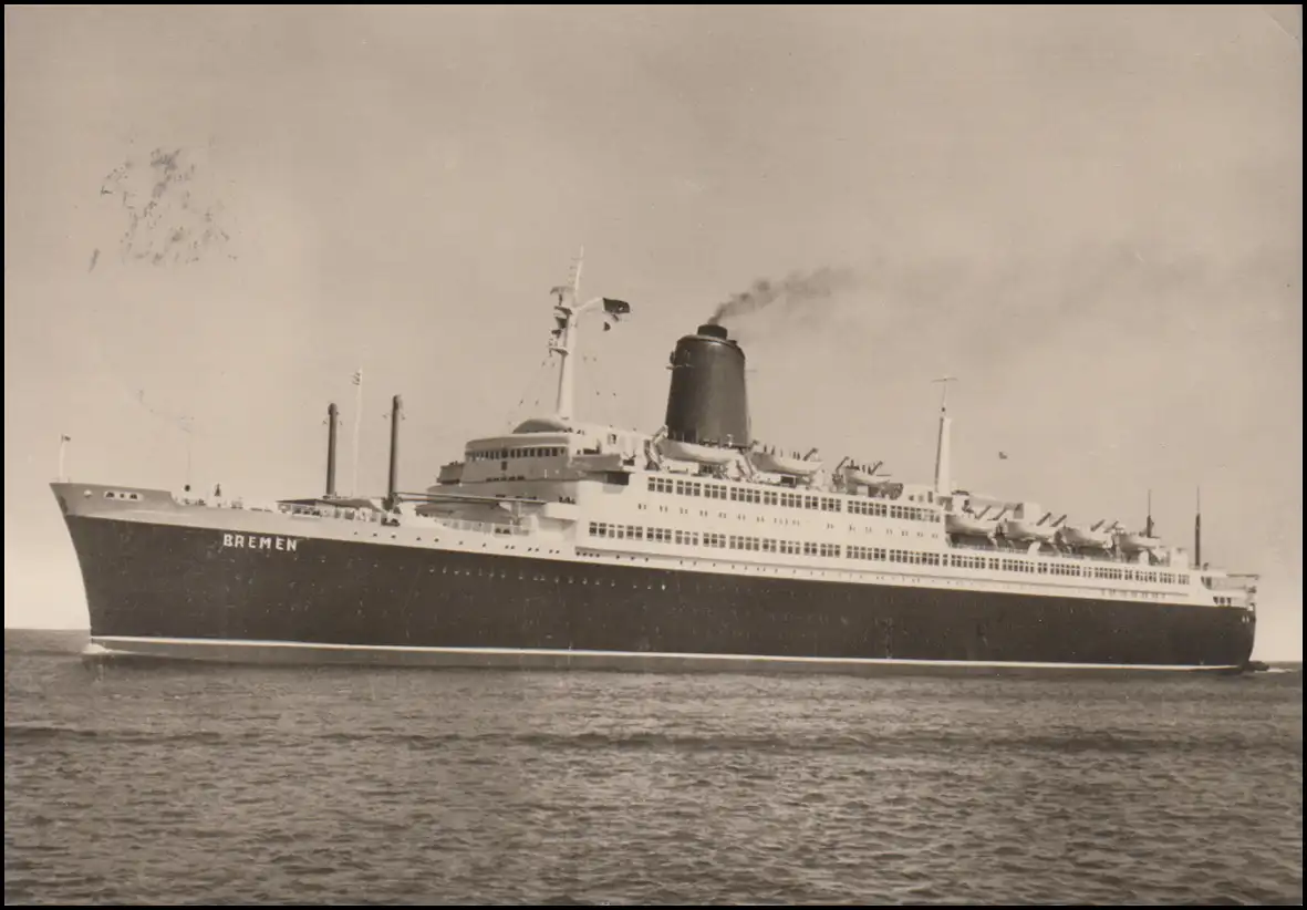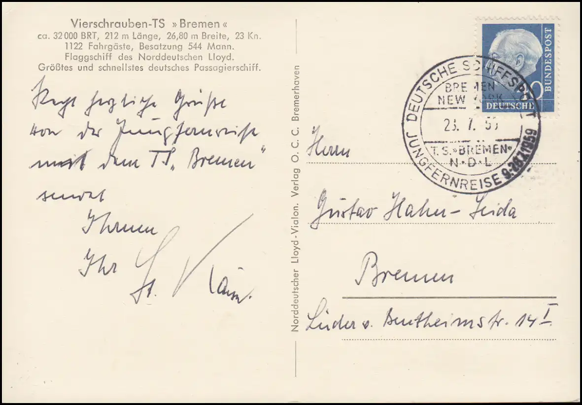 DEUTSCHE SCHIFFSPOST TS BREMEN Jungfernreise 26.7.1959 auf passender AK