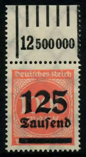 125 Tsd auf 400 Mark Wert aus der Aufdruckausgabe, Ziffern im Rechteck, Arbeiter und Ziffern im Kreis, im Oberrandbereich etwas fleckig