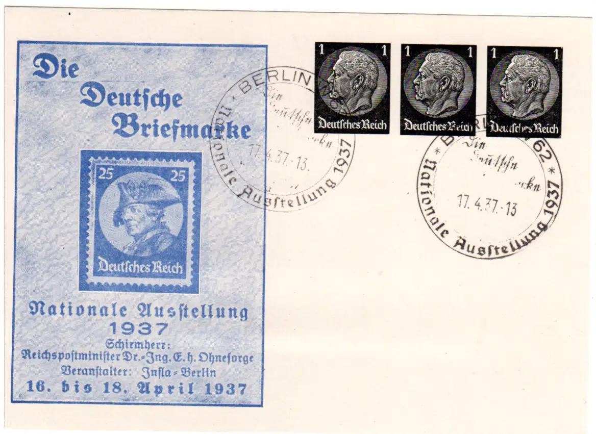1+1+1 Pf. Privatganzsachenkarte Die Deutsche Briefmarke, Nationale Ausstellung 1937 mit entsprechendem Berlin W 62 Sonderstempel