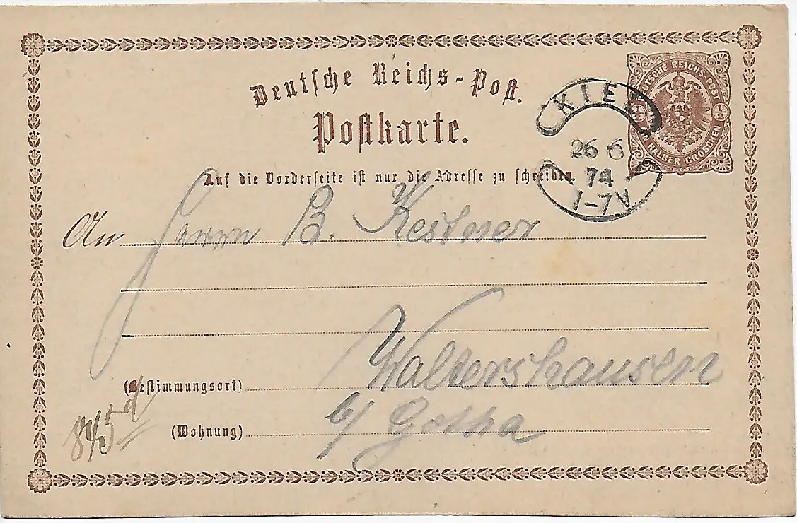 DR: 1874 Hufeistenstempel Kiel nach Waltershausen