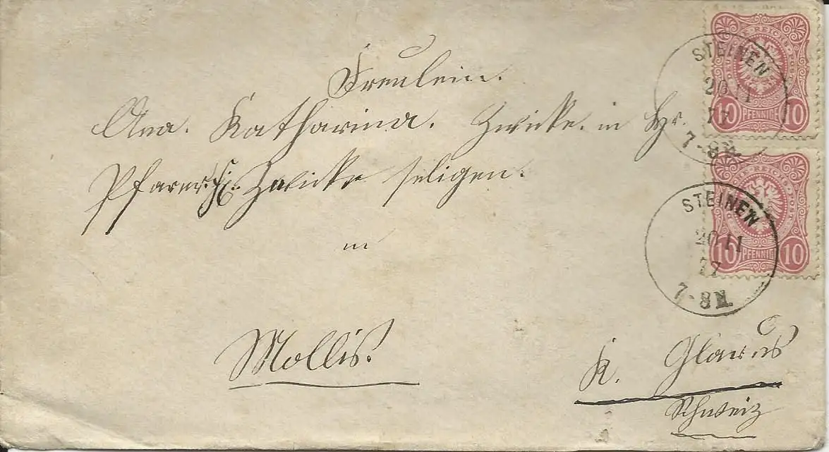 DR 1877, Baden-K1 STEINEN auf gesiegeltem Brief m. 2x10 Pfge. i.d. Schweiz #3027