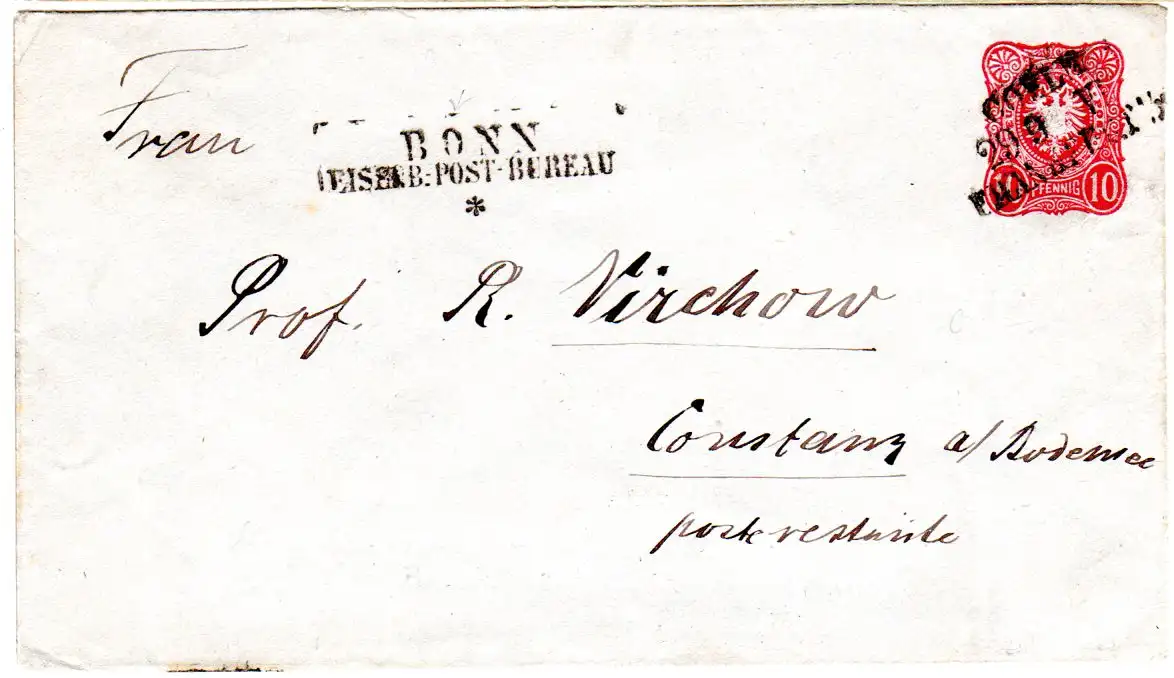 10 Pf. Ganzsachenumschlag m. Bahnpost-L3 und Aufgabe-Stationsstpl. BONN EISENB.POSTZ-BUREAU. Constanz Ank.Stpl. rückseitig.