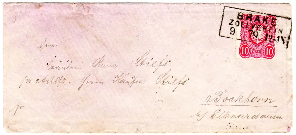 DR 1879, R3 BRAKE ZOLLVEREIN klar auf Brief m. 10 Pfge. nach Bockhorn