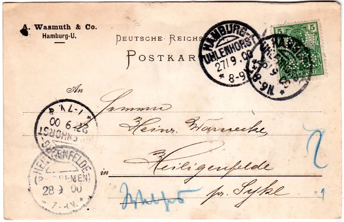 5 Pf. m. Firmenlochung A.W.&Co. (A. Wasmuth & Co., Chemie, Pharmazie) auf Karte n. Heiligenfelde