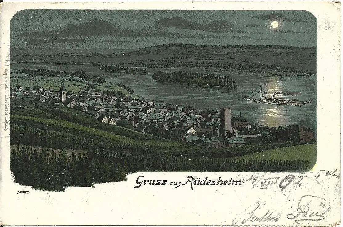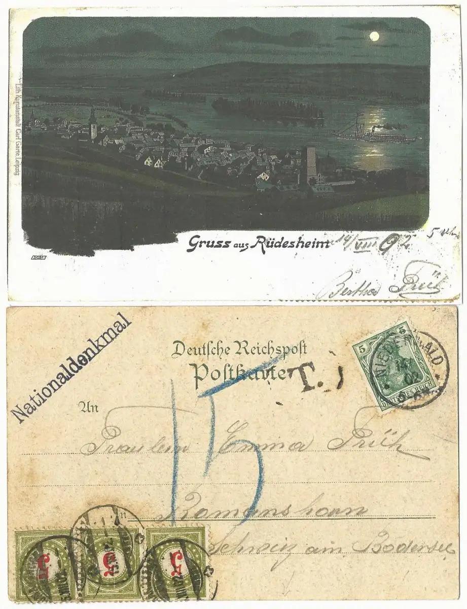 Schöne Mondschein Lito Gruss aus Rüdesheim m. 5 Pf. u. "T" Portostpf. v. Niederwald nach Romanshorn. 3er-Streifen 5 C. Portomarken. Leichte Patina (siehe scan).
