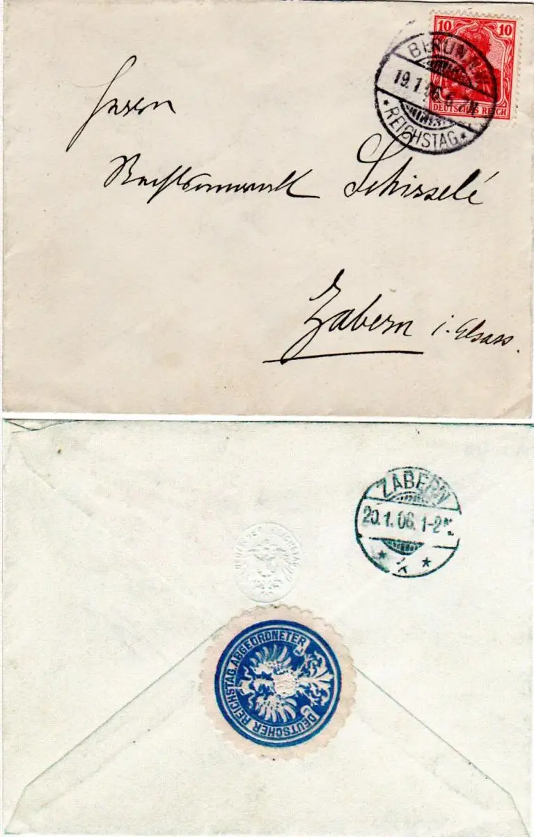 Brief m. 10 Pf. Germania v. Berlin NW Reichstag ins Elsass. Umschlag m. rücks, Prägung DEUTSCHER REICHSTAG sowie Siegel DEUTSCHER REICHSTAG ABGEORDNETER