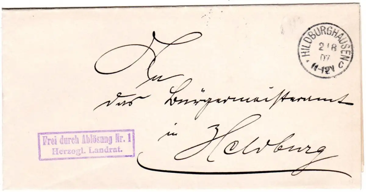 DR 1907, Frei durch Ablösung No.1 Herzogl. Landrat auf Brief v. Hildburghausen
