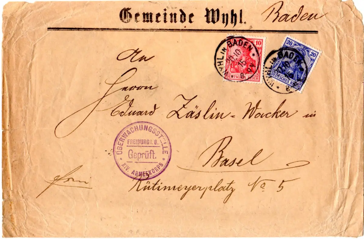 DR 1915, 10+20 Pf. als selt. Grenzrayon-Frankatur auf Brief v. Wyhl i.d. Schweiz