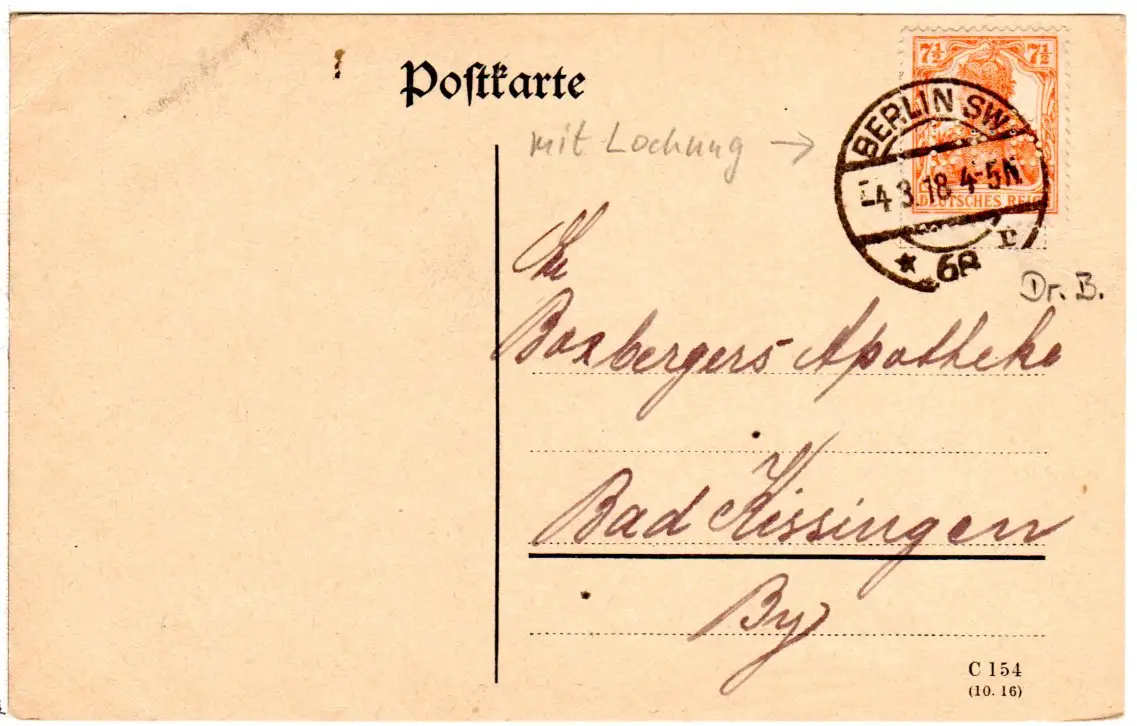 78 1/2 Pf. m. Firmenlochung Dr.B. auf Karte v. BNerlin SW 68 n. Bad Kissingen.