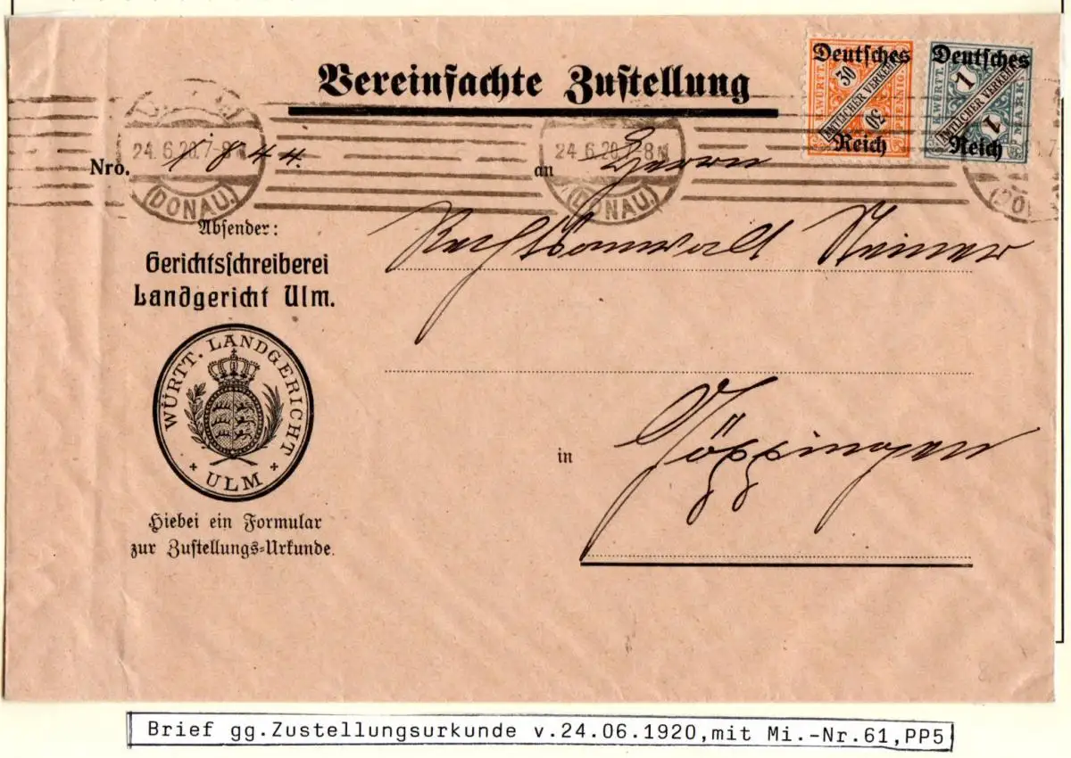 DR 1920, 30 Pf.+1 Mk. Dienst auf Zustellungsurkunde Brief v. Ulm n. Göppingen