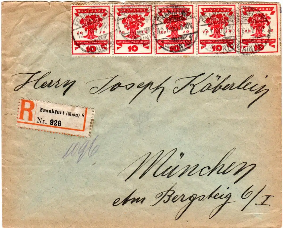 DR 1920, MeF 5x10 Pf. Nationalversammlung auf Reko Brief v. Frankfurt a. M.