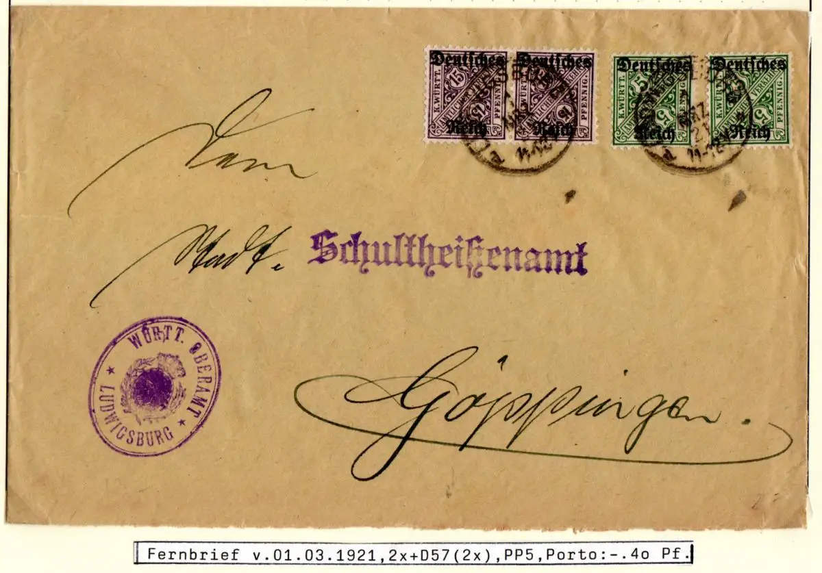 DR 1921, je 2x 5+15 Pf. Dienst auf Württemberg Oberamt Brief v. Ludwigsburg