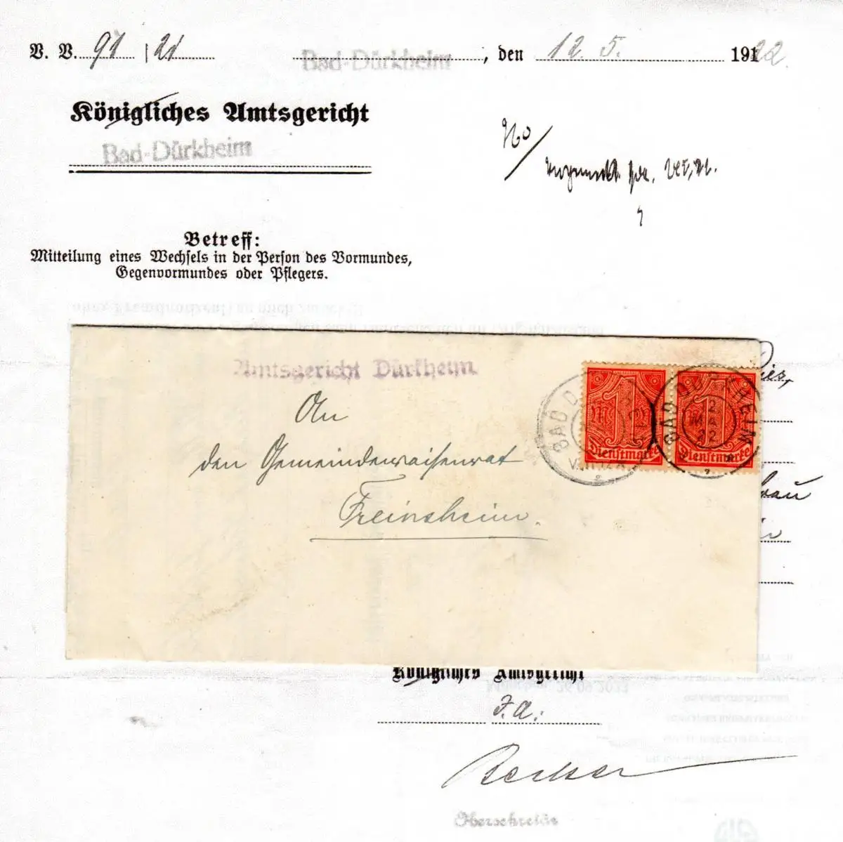 DR 1922, MeF Paar Dienst 1 Mk. auf Brief v. Bad Dürckheim n. Freinsheim. Geprüft