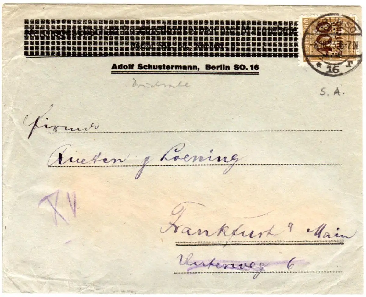 400 T./40 Mk. m. perfin S.A. auf Firmenumschlag Adolf Schustermann. Offener Versand als Drucksache.